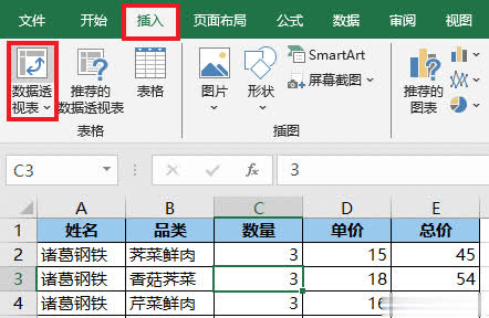 1. 选中数据表的任意单元格 --> 选择工具栏的“插入”-->“数据透视表”