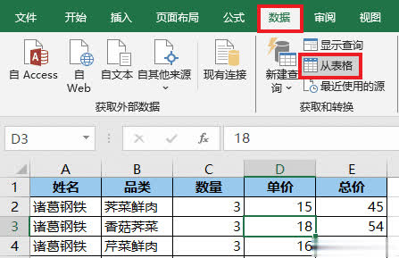 1. 选中数据表的任意单元格 --> 选择工具栏的“数据”-->“从表格”