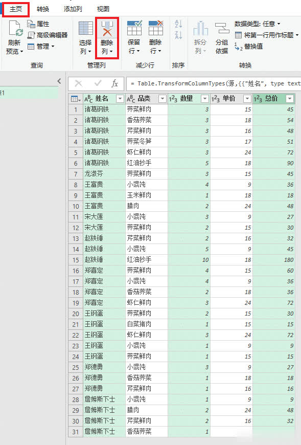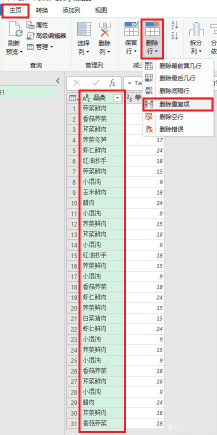 4. 选中“品类”列 --> 选择工具栏的“主页”-->“删除行”-->“删除重复项”
