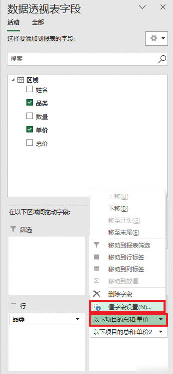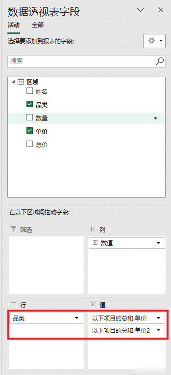 3. 将“品类”拖动到“行”区域,“单价”拖动两次到“值”区域。