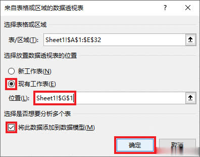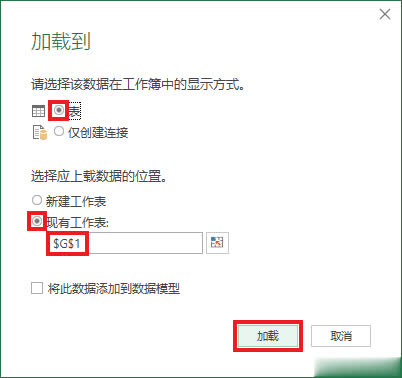 2. 在弹出的对话框中选择“现有工作表”及所需上传至的位置 --> 勾选“将此数据添加到数据模型”--> 点击“确定”